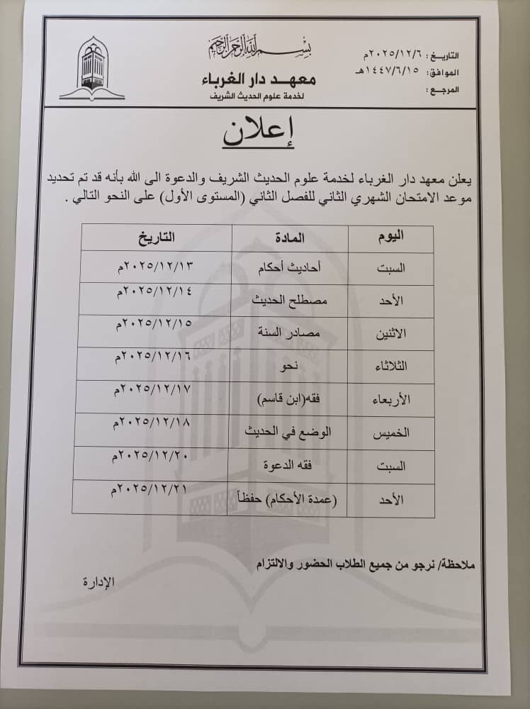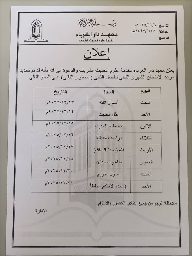يعلن اليوم السبت 22 جمادى الآخرة 1447هـ الموافق 13 ديسمبر 2025م، بدأت امتحانات الشهر الثاني للفصل الدراسي الثاني لطلاب المستوى الأول والمستوى الثاني في معهد دار الغرباء لخدمة علوم الحديث الشريف، وسط أجواء تعليمية منظمة، متمنين لجميع الطلاب دوام التوفيق والنجاح. هذا وقد تم الإعلان عن جدول الامتحان من وقت سابق بتاريخ 6/12/2025 موضحا بالصور. لمتابعة أخبار المعهد على مواقع التواصل الإجتماعي : الموقع الإلكتروني : https://www.daralgrba.com/ar الفيسبوك : https://www.facebook.com/share/1B4EgRe1bb/ الواتساب : https://chat.whatsapp.com/C0a5guSPzfa29rNytaMhNc?mode=ac_t الإنستقرام : https://www.instagram.com/dar.alghuraba?igsh=dHltMGw3ajZ0OWJu